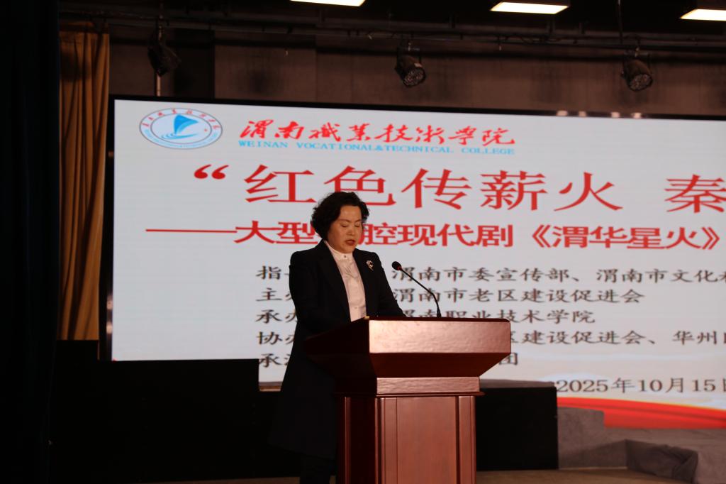 10月15日晚,“红色传薪火 秦声颂老区”--大型秦腔现代剧《渭华星火》巡演活动在我校高新校区报告厅拉开帷幕。渭南市老区建设促进会会长刘巧莲、渭南市委社会工作部副部长刘甫建,我校党委副书记姜小卫、副校长王韦华等领导参加活动。