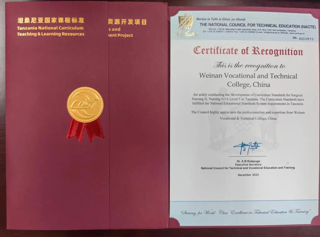 学校积极参与开发国际教学资源,为坦桑尼亚国家课程标准和课程资源开发项目建设单位,负责开发的护理专业NTA5级《护理学Ⅱ》《外科护理学Ⅱ》两门课程标准已被坦桑尼亚国家职业教育委员会审核认证,并签发认证函。